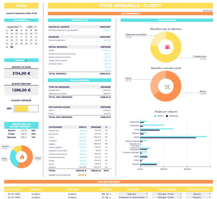 Je n'ai jamais réussi à trouver le template parfait pour mon besoin, alors je l'ai créé moi-même. Clarity, c'est un outil de fou : il est simple, mais il est complet car il y a tout ce qu'il te faut pour démarrer. J'ai également accordé de l'importance à l'esthétique parce qu'un joli template, ça donne envie d'être rempli et on prend plaisir à l'ouvrir.